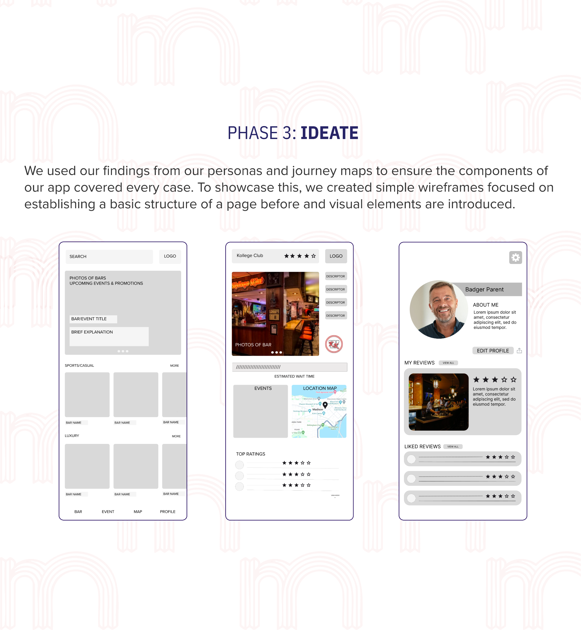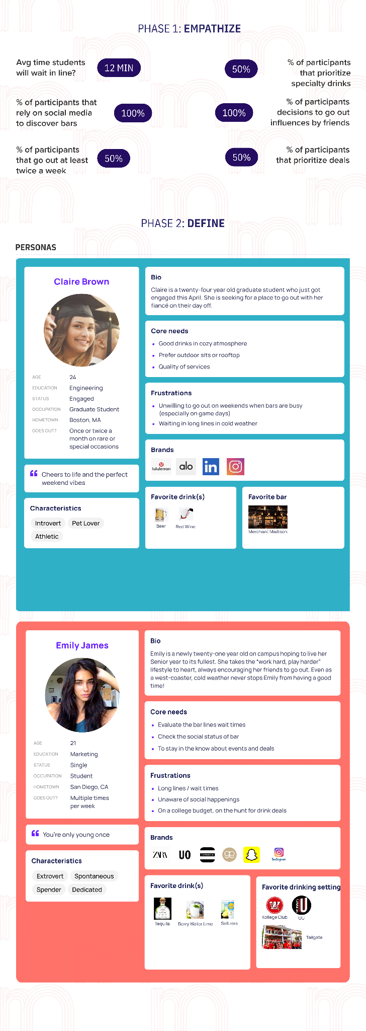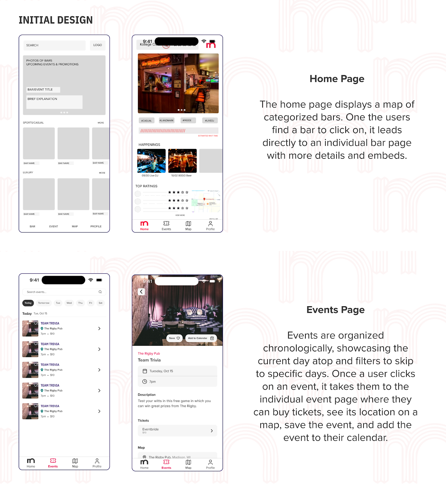 Through the design thinking process, we have developed a dynamic mobile application for Destination Madison that caters to the unique lifestyles and preferences of its users. By incorporating features such as real-time capacity tracking, bar reviews, search filtering, and event highlights, the app enhances planning and coordination for nights out in Madison. Our process involved in-depth user research, iterative prototyping, and feedback-driven refinements, ensuring that the app aligns with the needs and expectations of its audience. The result is a tailored solution that not only simplifies decision-making for users but also strengthens Destination Madison’s role as a hub for the city’s vibrant social scene.