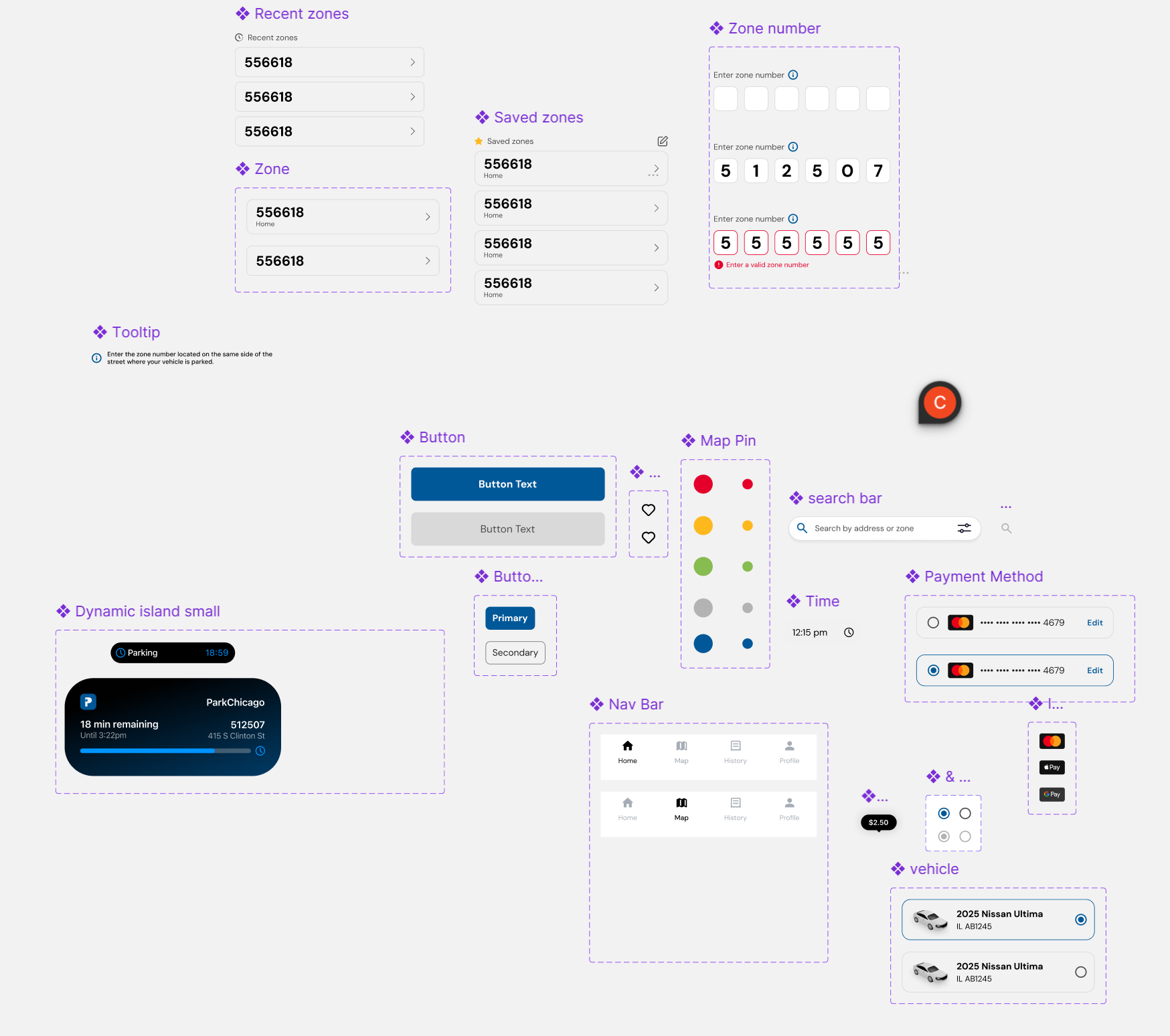 Wire frames focused on restructuring the payment flow and reintroducing the map as a core feature. Early iterations explored placing the map on the home screen; however, feedback and discussion led us to prioritize zone selection first to preserve familiarity for existing users. From the research, we identified common participant characteristics that we could use to set a range for our personas.