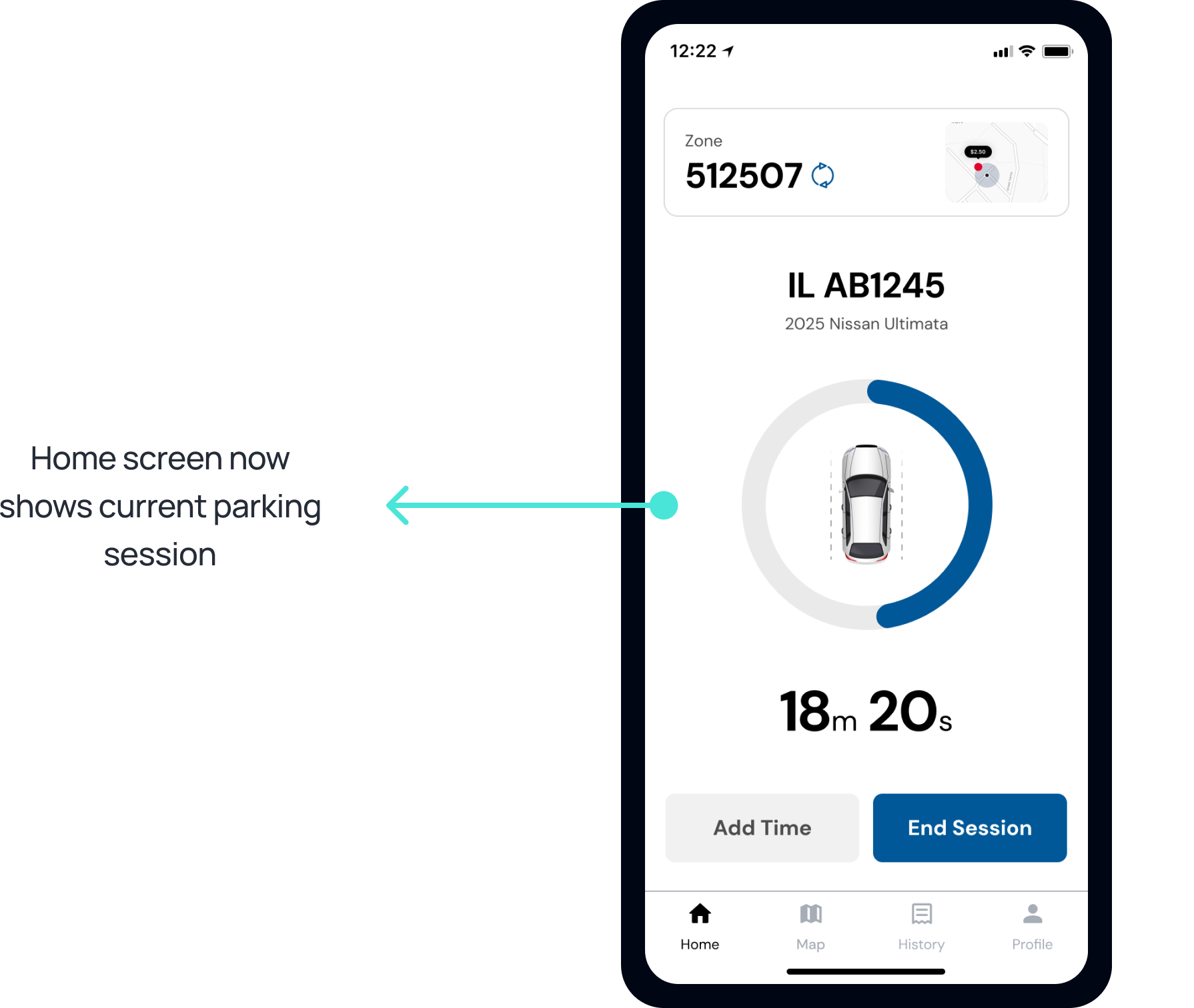 The home screen was updated to provide clearer feedback on active parking sessions, preventing users from accidentally starting multiple sessions simultaneously.